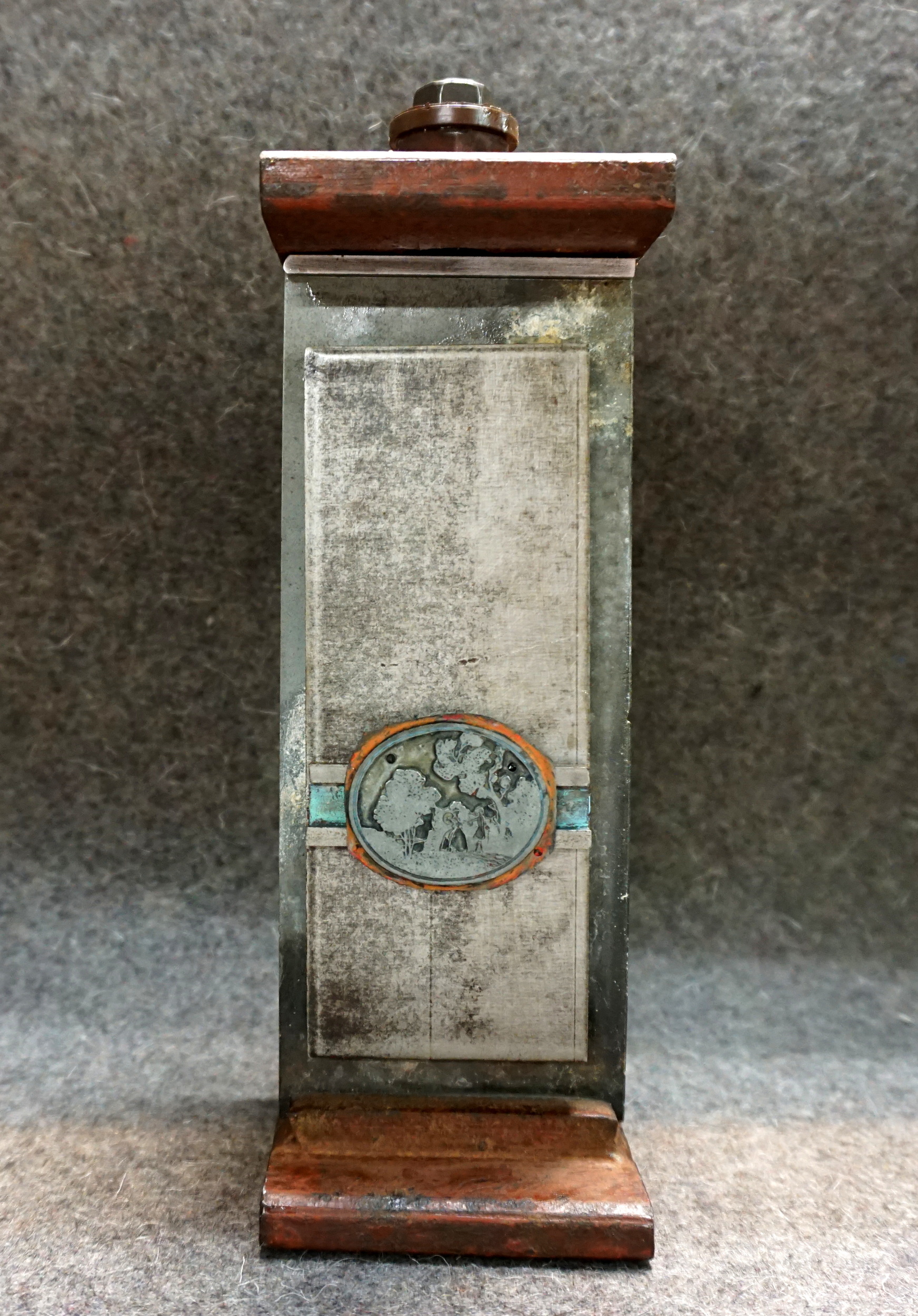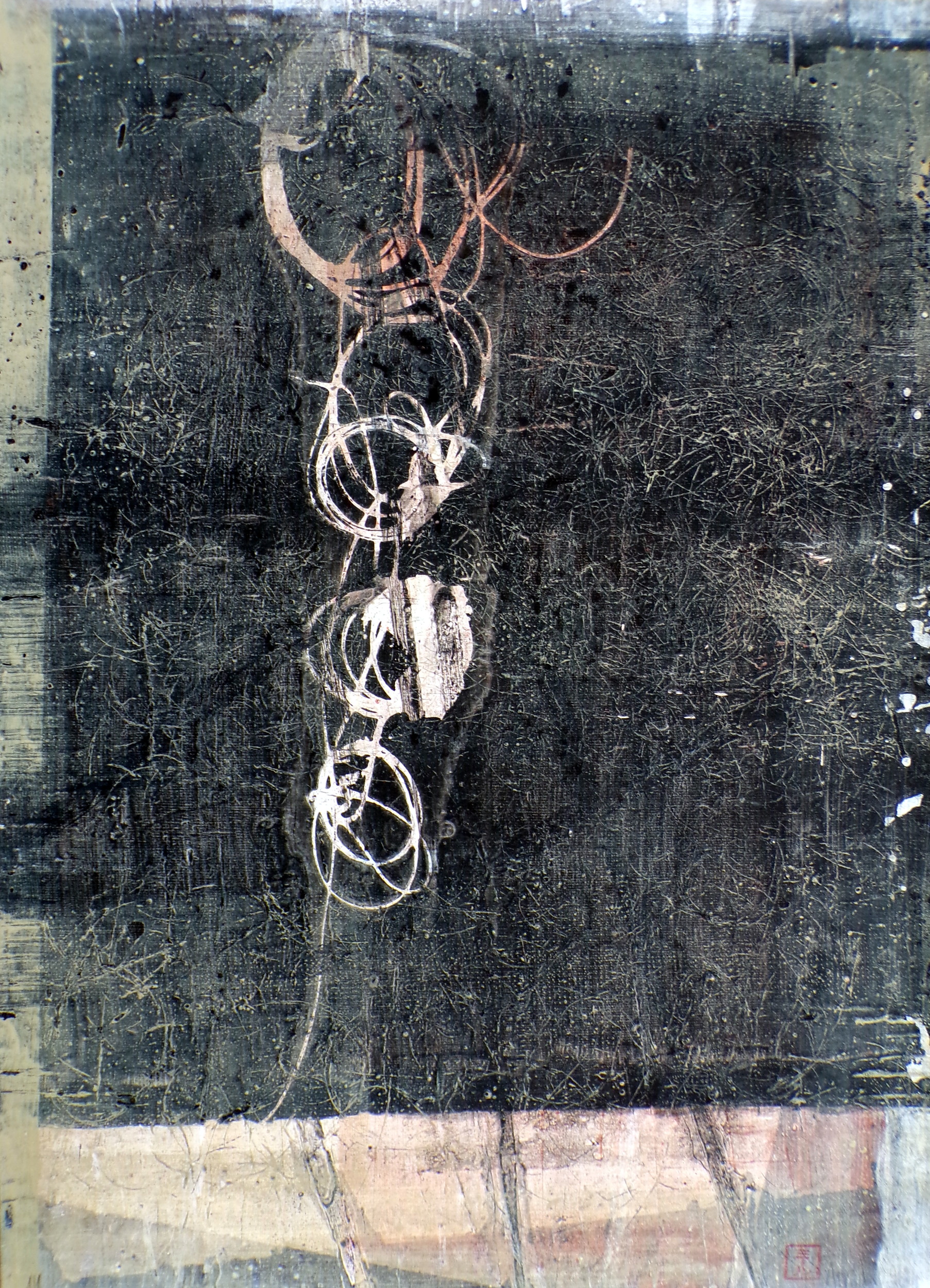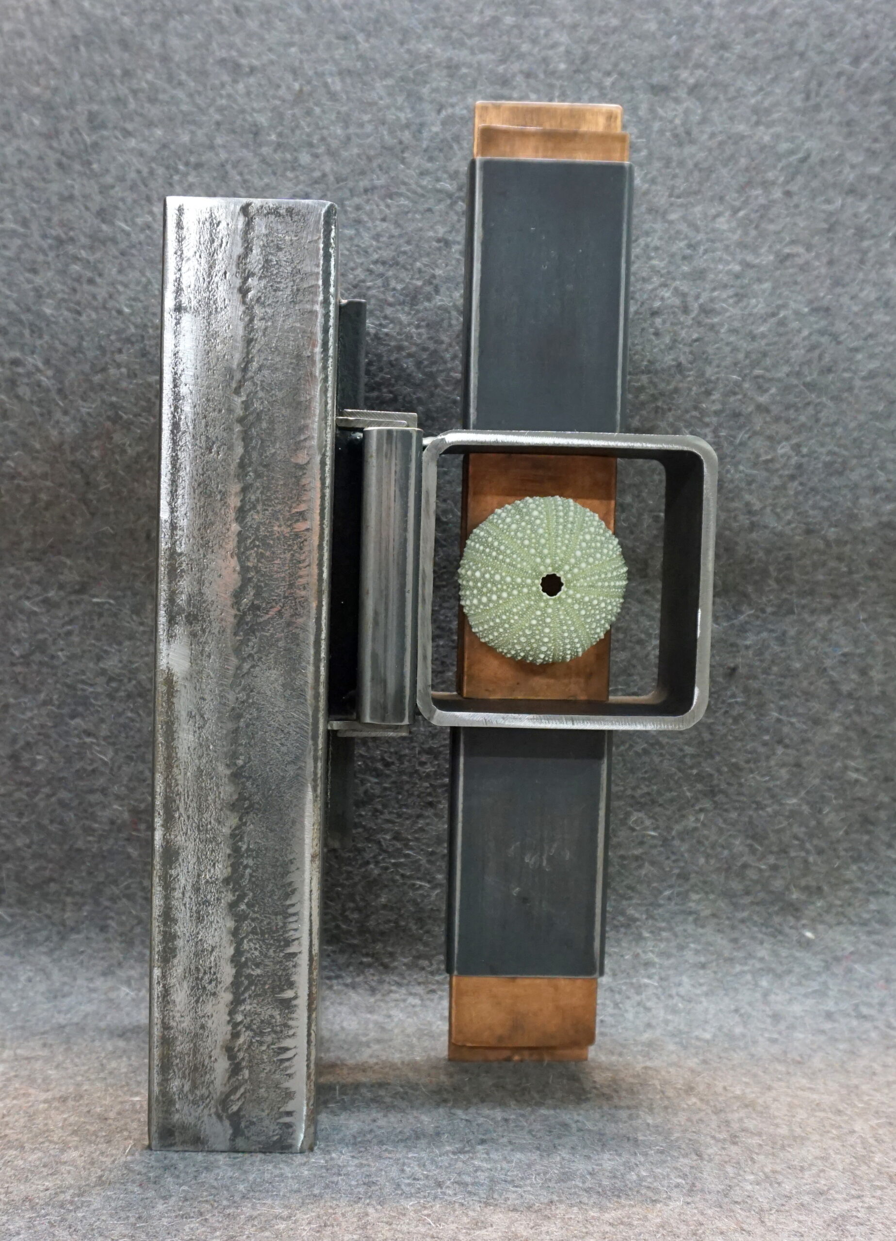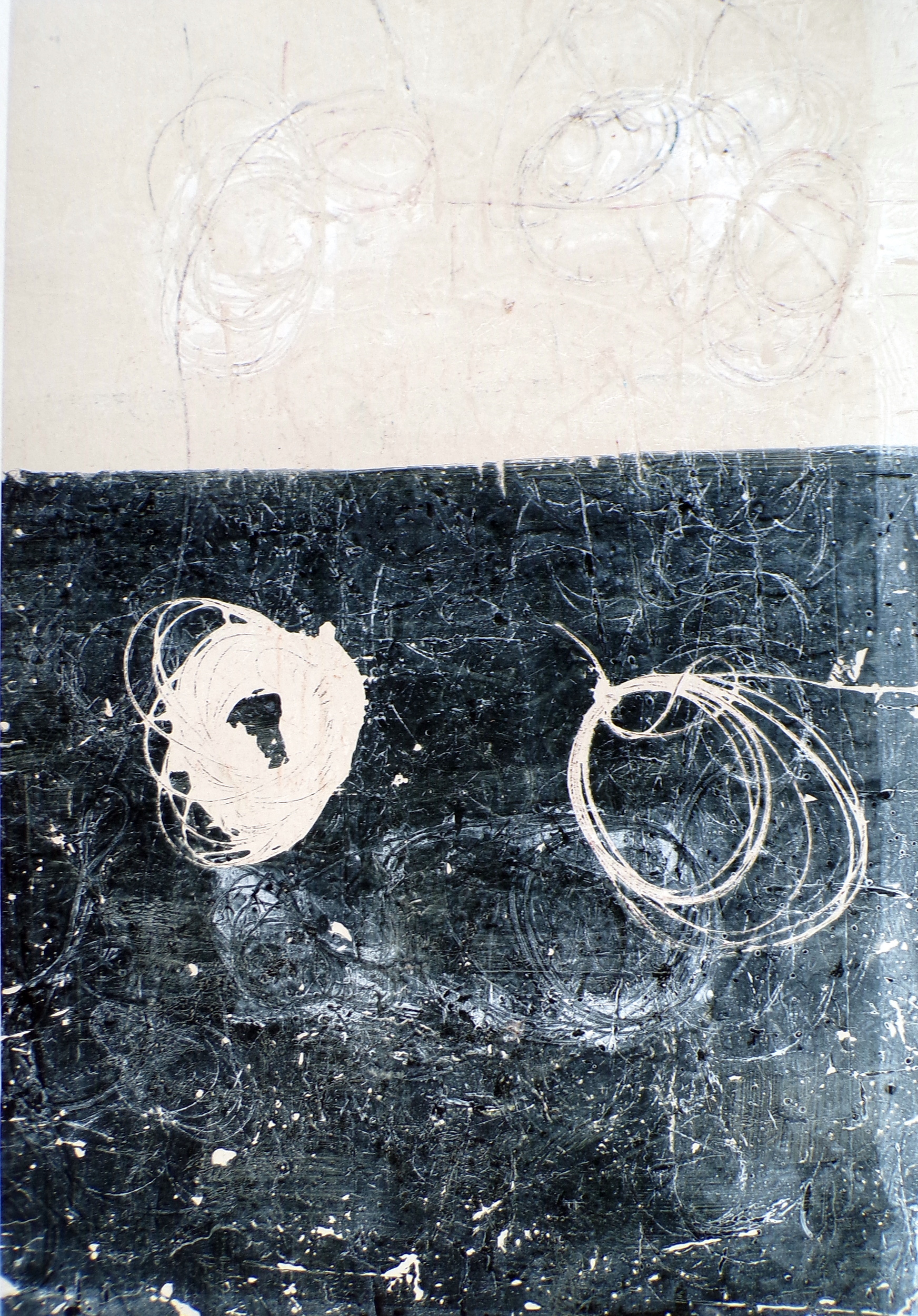 Surface noire, lisse, mate ou rongée par l’acide, je révèle le métal, par cet acte, je tends à le découvrir comme aux premiers temps. Les compositions sont singulières, sans trop de tonalité dominante. Les formes semblent vouloir donner le sentiment d’une phase primitive du sujet, durant laquelle, elles n’auraient pas encore atteint leur apparence définitive ou s’en éloigneraient.